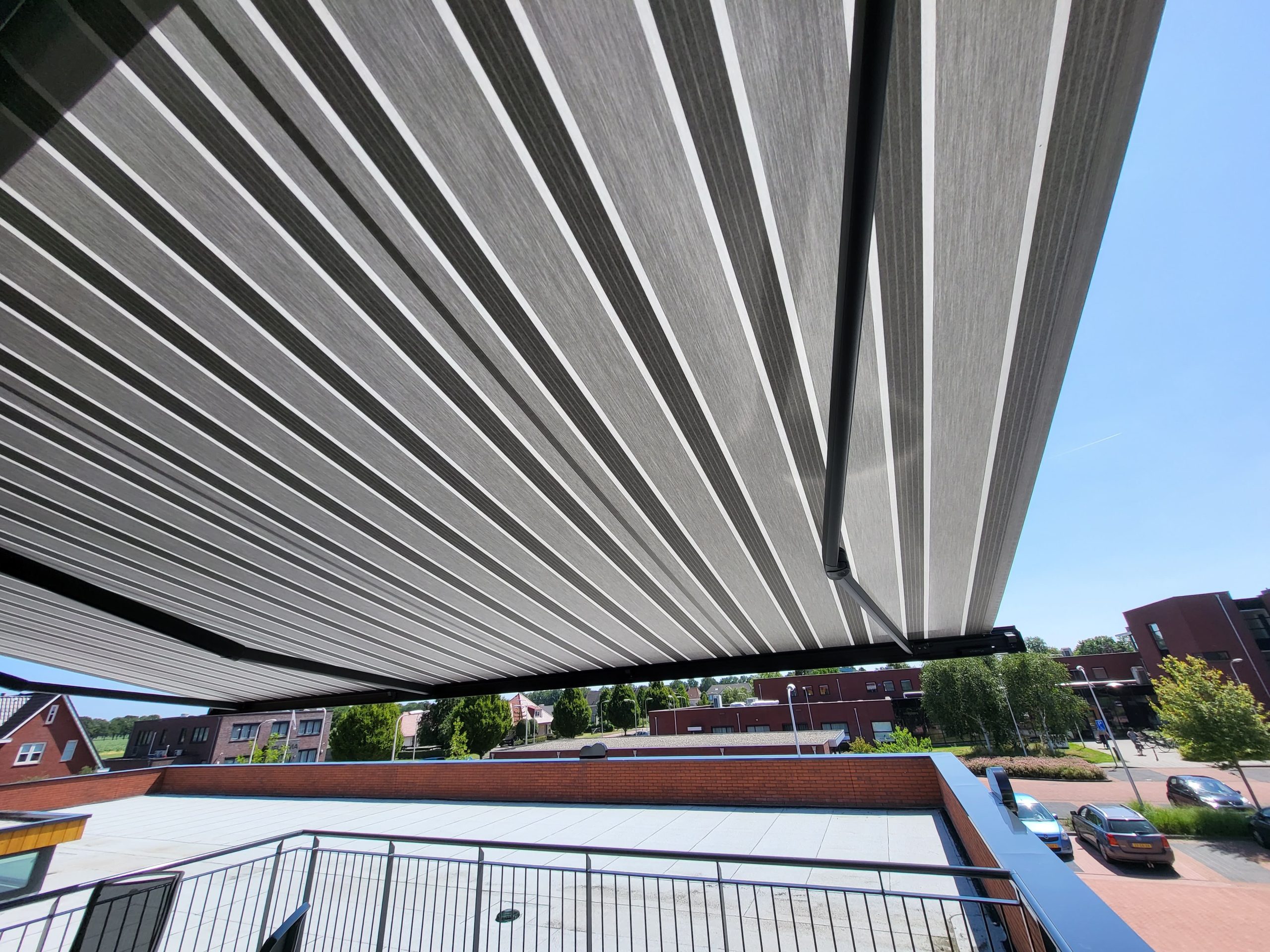 knikarmscherm donker licht grijs gestreept dakteras onderaanzicht 2
