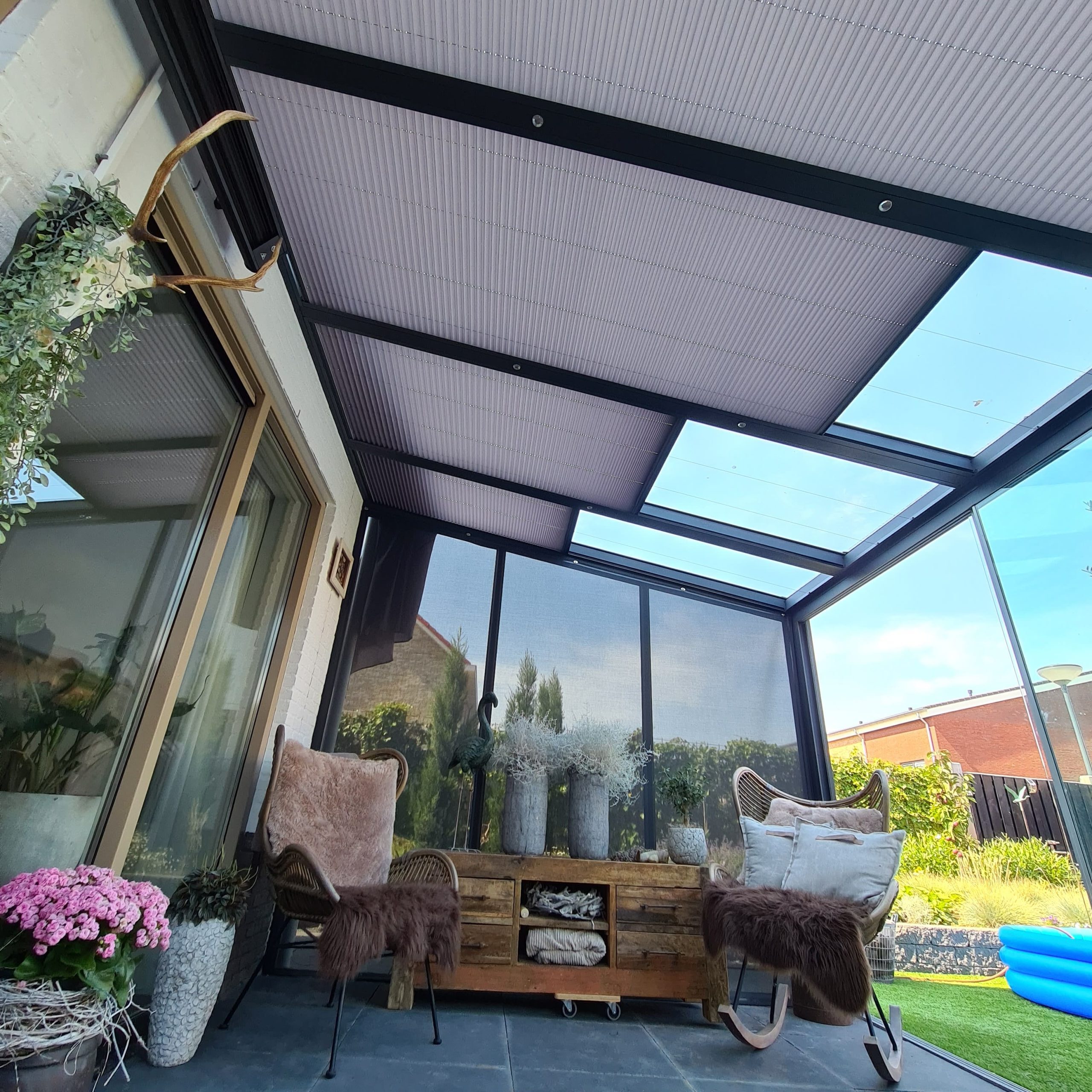 plissé terrasoverkapping schuin dak half open
